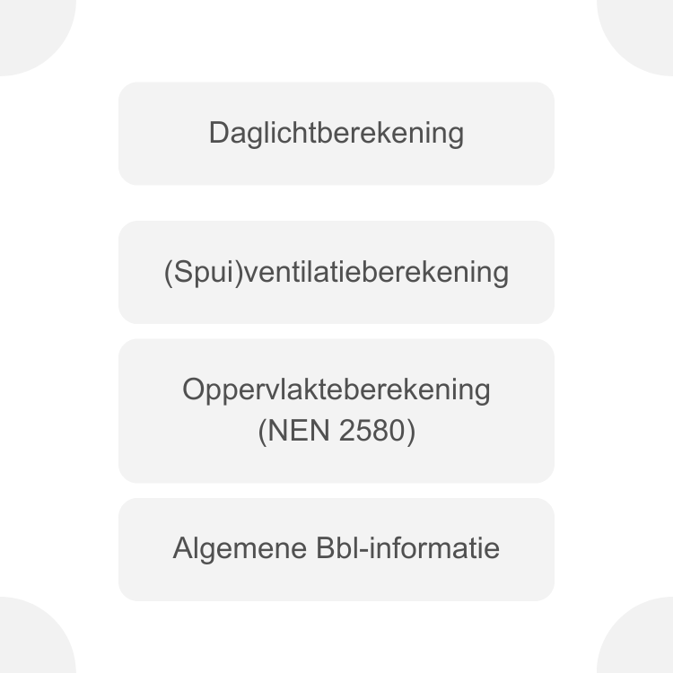 Om te voldoen aan de nieuwbouweisen is een Besluit bouwwerken leefomgeving berekening vereist (voorheen het Bouwbesluit). In deze berekening wordt onder andere getoetst of de woning voldoet aan de eisen voor daglicht, spuioppervlak en ventilatie, zodat een gezond leefklimaat wordt gewaarborgd.